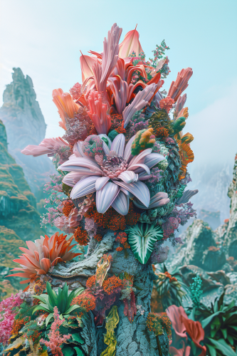 an artificially made landscape in the shape of an island, in the style of colorful biomorphic forms, realistic renderings of the human form, focus on joints/connections, sculpture-based photography, medical imaging film., foampunk, rough clusters, a large colorful flower in the middle of the screen, in the style of realistic renderings of the human form, organic formations, northern china's terrain, filthy sculptures, light emerald and orange, rendered in cinema4d, loose and fluid forms, a large flower made with various flowers and leaves, in the style of rendered in cinema4d, northern china's terrain, fluid formations, scarlett hooft graafland, psychedelic figuration, ethereal cloudscapes, melting, a flower bouquet on the background, in the style of alberto seveso, rendered in cinema4d, expansive landscapes, johnson tsang, nature-inspired camouflage, filthy sculptures, transparent/translucent medium, 8k, ray tracing --ar 2:3 --v 6.0