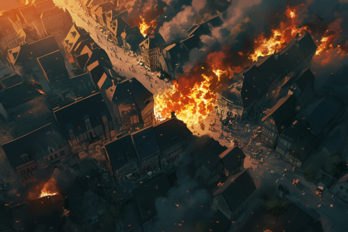 an aerial view of a small town exploding with fire and smoke + horror + art style of Capullo, Brom, Whelan, aly fell rutkowski, art germ, rossdraws, and franzzeta + art station + ultra detailed + hyper realistic + 8k --ar 3:2 --niji 6