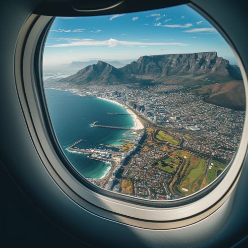 view from an airplane window to capetown and camps bay. sunny. high quality photography --v 6.0