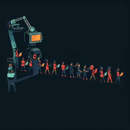 a machine inspecting users carrying their laptops, long queue of people, cheerful vibes, 2d, vector, dark mode background --no realistic detail --v 6.0 --s 50 --style raw