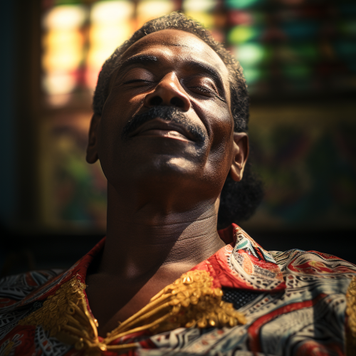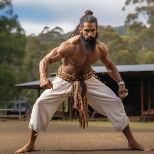 an australian aboriginal actor in his early 30s playing jeffry virtua fighter in a 2023 live action film: hyperrealistic live action image: dark skin tone: wearing ponytail: bushy beard: white pants: fighter-style outfit capoeira: wearing gray sandals: brown bracelet: fighter pose: side pose: enter the dragon movie scenery" background: muscular actor: tall actor: 100 mm: action scene: fight scene atmosphere: cinematic lightning: cinematography: detailed skin texture: insane details: natural lightning: shadows: super detailed: super resolution: volumetric: -