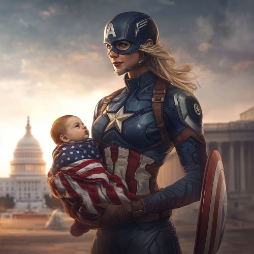 female captain america, whole body visible, photo realistic, american flag, New York City backdrop, red color, white color, blue color --ar 5:10 --no extra fingers --s 250