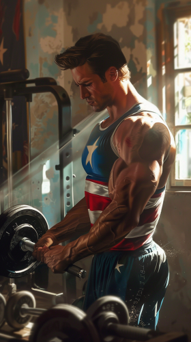 Imagine Captain America, fully dressed in his iconic red, white, and blue uniform, lifting weights in his personal gym room. He’s engaging in an intense workout session, handling a heavy dumbbell with ease. The room is well-equipped for a superhero’s training needs, featuring a variety of gym equipment and heavy weights. Sunlight filters through a window, casting dynamic shadows and highlighting the patriotic colors of his suit and the determination on his face. This scene showcases Captain America’s unwavering discipline and strength, even during his routine exercises, fully embodying his role as a symbol of endurance and resilience. --ar 9:16 --v 6.0