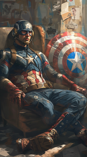 Picture Captain America, dressed casually, sitting in his room with headphones on, deeply engrossed in listening to music. His shield is resting against a nearby wall, visible in the background. The room is simple and functional, decorated with a few personal memorabilia that reflect his long history. He's seated comfortably in an armchair, eyes closed, with a slight smile, enjoying a moment of peace and solitude away from his duties as a superhero. This image captures a private side of Captain America, showing him unwinding and connecting with modern culture through music --ar 9:16 --v 6.0