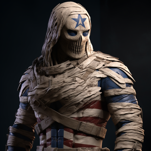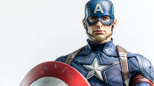 wearing a Captain America costume with shield, turn to font of frame, white background, photorealistic, cinematic lighting, warm light, rim light, lens 135mm, 4k, --ar 16:9