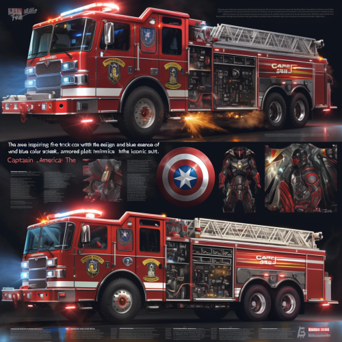 "An awe-inspiring fire truck completely transformed with the design and essence of Captain America. The truck boasts a striking red, white, and blue color scheme, with sleek, armored plating that mimics the texture of Captain America’s iconic suit. The front of the truck is boldly emblazoned with a massive, glowing version of Captain America’s indestructible shield, its star shining brilliantly in the center, radiating light across the truck. The headlights, shaped like the emblem's star, emit a bright, pure white glow, symbolizing courage and justice. Along the body of the truck, strategic military-style reinforcements blend seamlessly with elegant star and stripe patterns, representing Captain America’s patriotism and tactical genius. The truck's massive wheels feature spinning star-shaped hubs, glowing in a blue aura as if charged with energy from the hero himself. Mechanical components are meticulously detailed, with shield-shaped armor protecting vital parts, and reinforced panels styled like tactical gear. The scene is set in a majestic urban landscape at sunrise, with golden light illuminating the vehicle as it stands ready to protect and serve. The truck pulses with a soft, rhythmic red, white, and blue glow, symbolizing the heartbeat of freedom and Captain America’s unwavering commitment to defend justice and liberty." --s 750 --style raw --niji 6