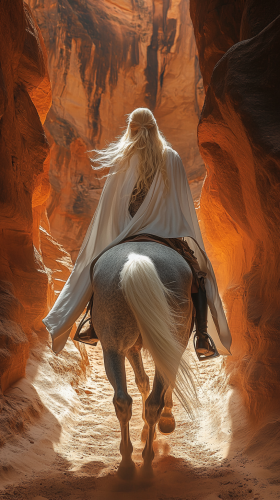 horse sprinting, dark gray dapple horse with white mane and tail, blonde female with long hair riding with ancient white cloak and tunic with pants, red orange rock canyon looks like antelope canyon, sunlight, high contrast, pov from behind, 8k detail, shot on a Sony Alpha a7 III camera --ar 9:16
