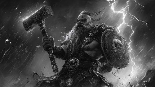 Warhammer style drawing of a dwarf shaman wielding a hammer in one hand and a shield in the other while lightning strikes around him, Charcoal Art, Cinematic, Black and White, High Contrast, 8K, Super-Resolution, Spotlight --ar 16:9