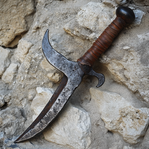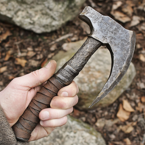Create an image of a Dolchstreithammer, a medieval German weapon combining features of a pick and a war hammer. This weapon has a cast conical bronze pick about 5 inches long designed as a narrow, pointed blade and the other as a flat hammerhead for blunt force. The head is held in a curved hand/fist. The handle is wooden, wrapped with leather, and features a metal guard near the blade. The weapon has a rustic, slightly worn look, showing signs of age.