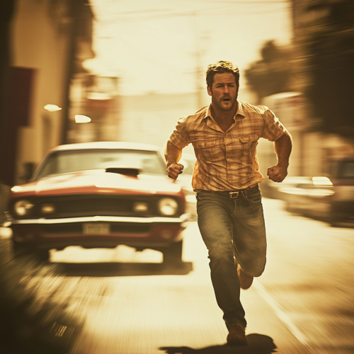 fast and furious paul walker running to his car, shot in a 1950s Panavision movie scene, shot in rich, vibrant Technicolor with soft focus edges, featuring a classic Hollywood style. The film grain is subtle but visible, replicating the texture of 1950s cinema. Realistic depth of field, high contrast, and slightly oversaturated colors, framed in a widescreen ar - 16:9