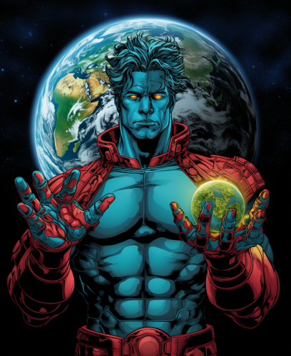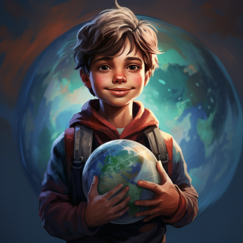A light brown haired 8 year old boy holding a globe wearing an outfit similar to Captain Planet smiling as the world behind him becomes a cleaner place, illustration, ultrarealistic