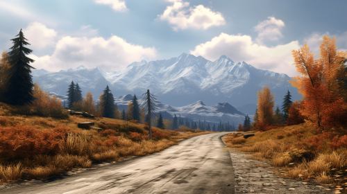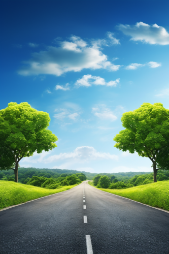 single straight road going through a green landscape into the horizon, bright sunny windy day, glowing horizon, plants and trees in surrounding environment, scenic beauty, high-quality, hyper-realistic, 8k quality --ar 2:3