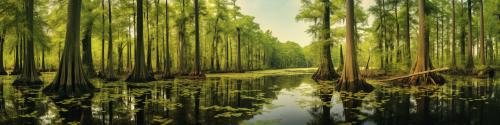 Cypress Swamp. panoramic photo of bald cypress swamp: cypress, swamp, grove, marshland, panoramic, tree, forest, nature, tree, landscape --ar 4:1 --v 5.2