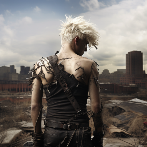 photo of male face, bleached punk hair, overlooking damaged postapocalyptic landscape, scenic, nature --c 15