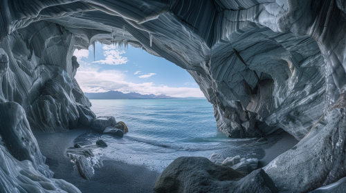 Marble Caves, Chile.fantasy. sony a7r V, 12mm, f/16, wide scenic shot –s 1000 --ar 16:9 --v 6.0