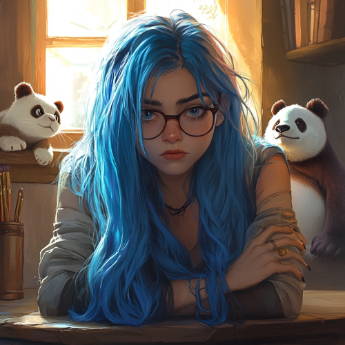 female cat with black blue long hair on her head, left side of her hair is shaved, brown eyes, and brown skin tone, wearing glasses, there is a hyperactive panda cub and sleeping sloth background, gaming and mom theme, angry
