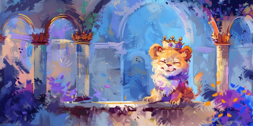 Cartoon illustration style, full of childishness and imagination. In the picture, a cartoon lion cub wears a crown and sits on the throne of the palace, with a rich and cute expression. The arches and Roman columns of the palace surround the lion, and the background is a deep blue-purple sky. adding an ancient and solemn atmosphere,Claude Monet, colorful brushwork --ar 2:1 --v 6.0