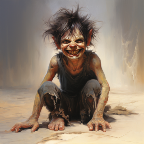 a demon child with a demonic expression, he has an unusually big smile. His hair is disheveled, he is hunchbacked, his fingers are very long. He is dressed in overalls and is barefoot. Painted