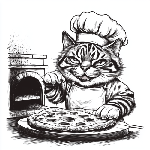A cartoon style cat with tiger stripes in a funny pose, chef's hat on, molding a pizza. stone oven in the background, otherwise the background is white. black and white illustration.