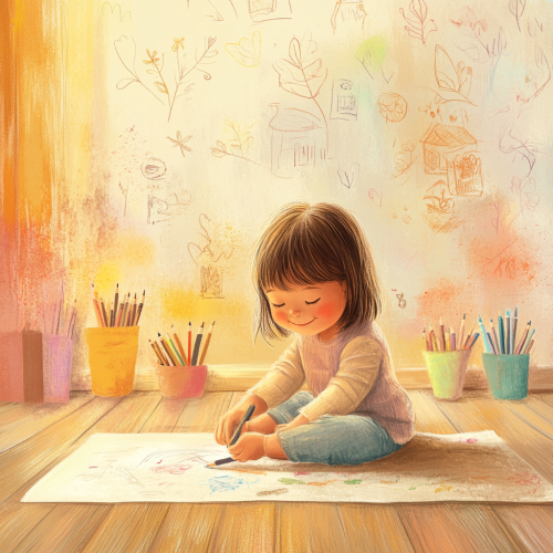 A young child happily drawing on the floor, 2D digital illustration in a hand-drawn style, cozy indoor room with wooden flooring, crayon drawings on the wall in the background, playful and whimsical mood filled with imagination and childhood innocence, soft pastel color palette with warm tones, childlike crayon art style, gentle lighting. --style raw --v 6.1