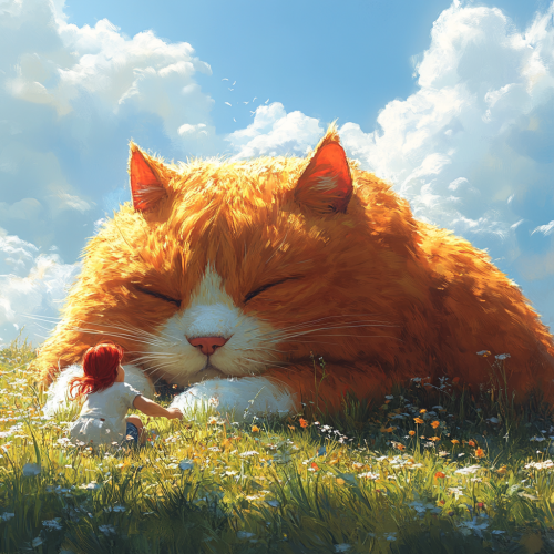 Full-length giant red cat lying contentedly on the grass, next to a small child with red hair stroking the cat, blue sky, light colors, Pixar cartoon style photo --s 750