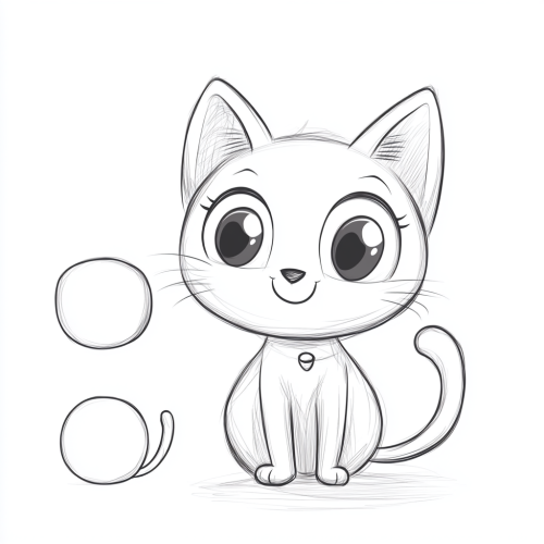 A step-by-step drawing guide for kids to draw a cute cartoon cat. The guide should show the cat in a simple, rounded style with big eyes, a small nose, and a smiling face. Start with basic shapes like circles and ovals for the head and body, then add details like the ears, whiskers, and a curled tail. The steps should be easy to follow, with clear and bold lines, and each step should be labeled to help the child understand the progression from start to finish