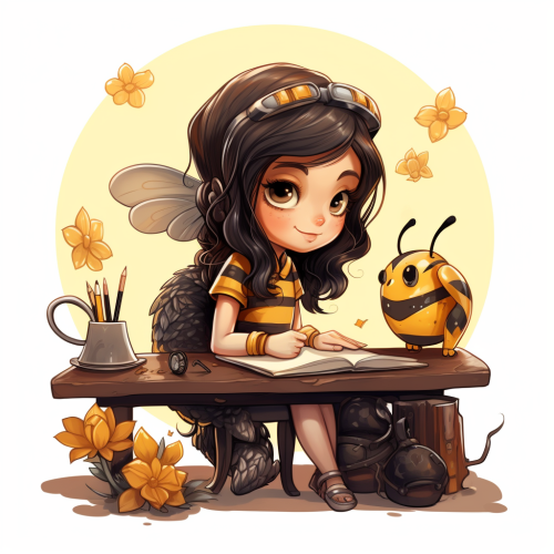 a child drawing her adult future about her professional tattoo life with a bee next to her - - cartoon style