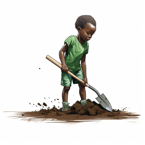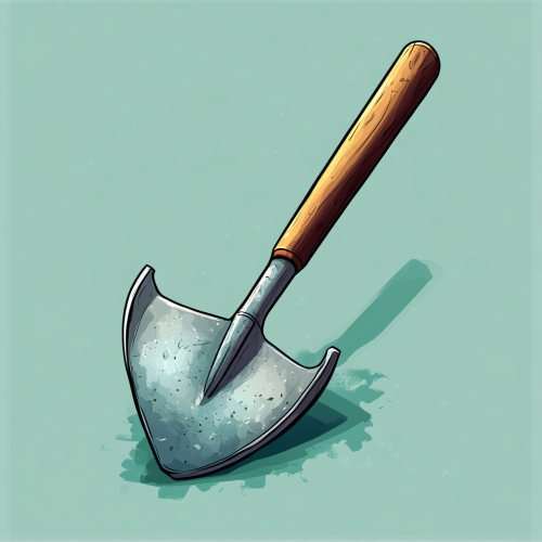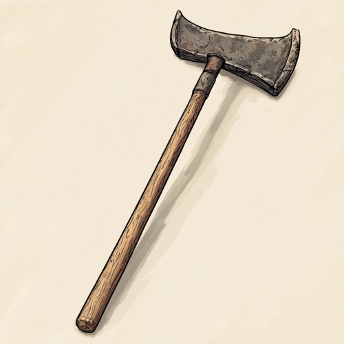 Create a rustic cartoon drawing of a garden hoe with a crooked neck. The hoe should have a charming, worn appearance, with a wooden handle that features visible grains and slight imperfections. The metal head should look slightly aged and uneven, emphasizing its practical, well-used nature. The crooked neck should be exaggerated for a whimsical effect, giving the hoe a unique, almost anthropomorphic character. The overall style should evoke a sense of warmth and simplicity, capturing the essence of a beloved garden tool.