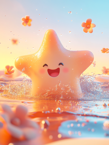 3D rendering of a cartoon star shape with water and flower elements on the ground, set against a gradient orange and blue sky background in a pastel color scheme, with bright lighting, created using C4D modeling and Octane rendering, in a cute style with high-resolution photography and high-level details. --ar 3:4 --v 6.1
