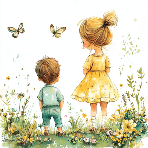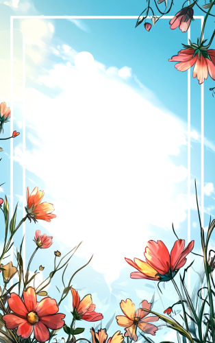 A blank white area in the center of an illustration featuring flowers and grass, with a sky background, in a cute cartoon style, colorful, with a watercolor effect, soft lighting, high resolution, and a white rectangular frame around it. --ar 5:8 --v 6.1