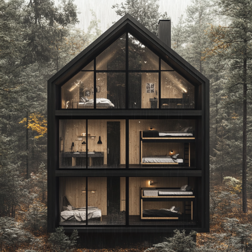 A sectional view of a modern black wood cabin in the raining forest. The cabin has a small open garden structured at center of the floor plan and separated by tall glass, each room of the floor has one sided glass panel wall from the center with bunk beds . The cabin has three floors with A shape roof with pierced peak center. The black wooden walls create a sleek exterior. Only the central glass panel offers a view of the weather conditions.