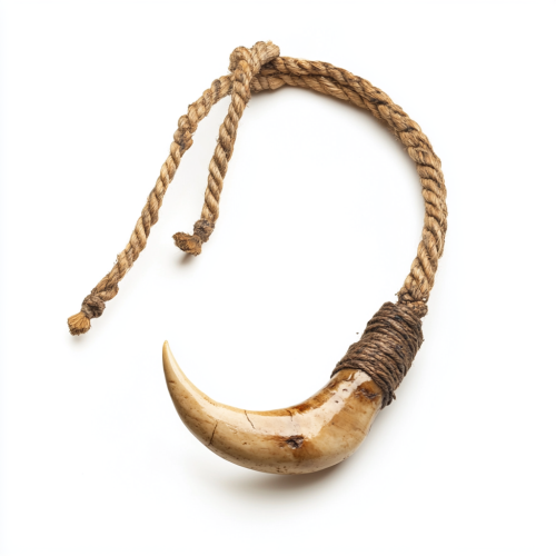 A photo of Maui the Polynesian God's magic bone fish hook. It's in the air coming towards and slightly to the right of the viewer attached to a rope that's coiled in the air behind it. Isolated on white --s 50 --v 6.1 --style raw