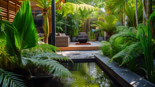 small uk backgarden transformed in tropical design garden. camera focussed on simple water feature, lots of green lush foliage plants of different heights, ferns, bamboo, flax, palms, sun corner, relaxed seating area, natural light, cosy inviting space, camera in focus, angled image --ar 16:9 --v 6.0