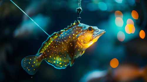 an enchanted flounder, glowing, hanging from a fishing hook --ar 16:9