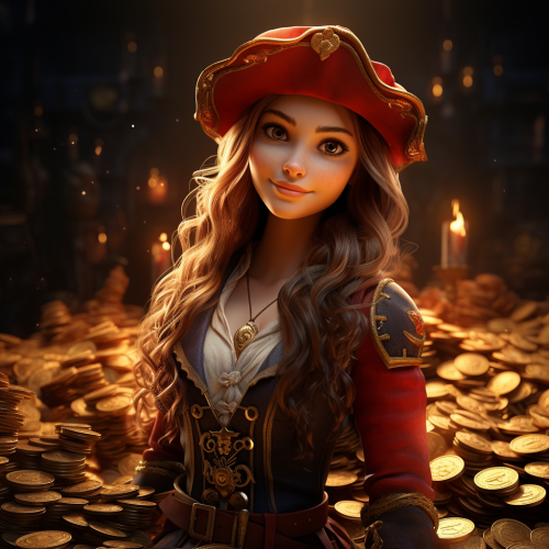 female pirate scattering gold coins, red colors, cartoon style, 3D rendering, unreal engine 5 --v 5.2 --s 250