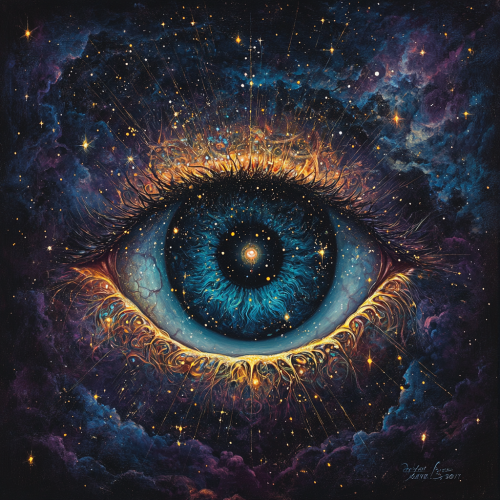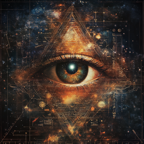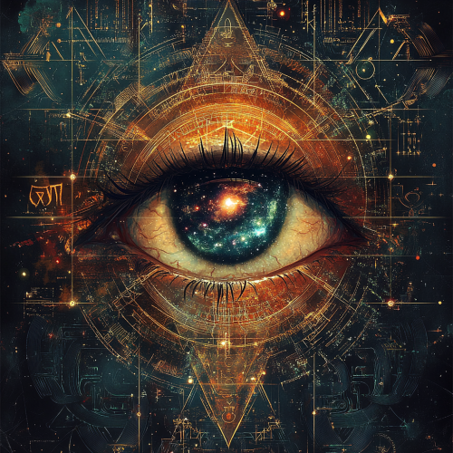 A digital art image of a large all-seeing eye, surrounded by intricate geometric patterns and ancient symbols, The iris is a swirling galaxy, and the eyelashes are made of celestial bodies.