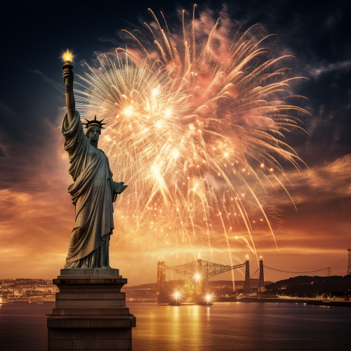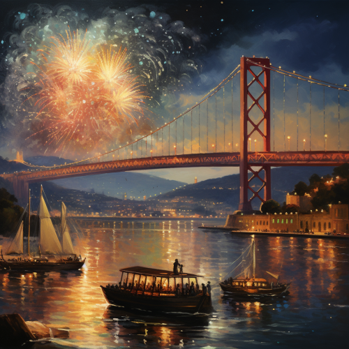 Fireworks in Lisbon. In the background, Christ Rei and the April 25th bridge. Illumination, beautiful lighting, Exquisite detail,sharp, super detaild