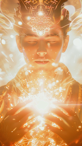 hyper realistic close up of an asian celestial being meditating in a zen setting. Glowing chakra and aura abundantly flowing. Mandela patterns. Magnificent, magical, fantastical, cinematic. --ar 9:16