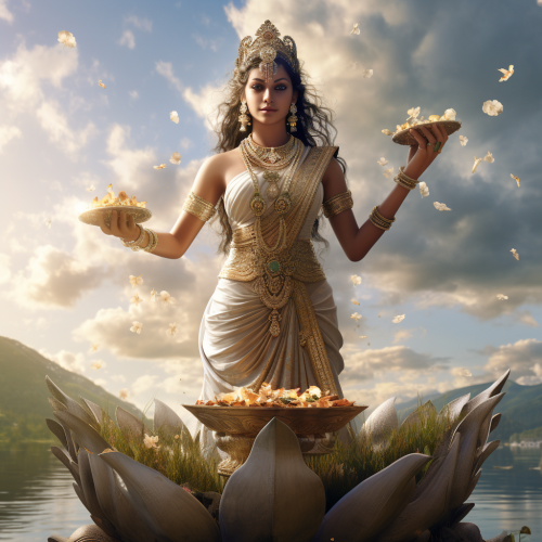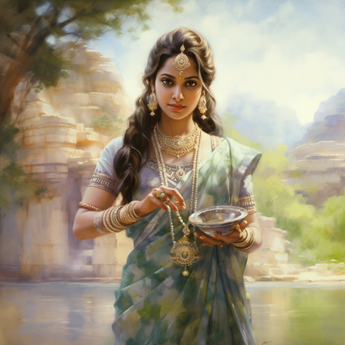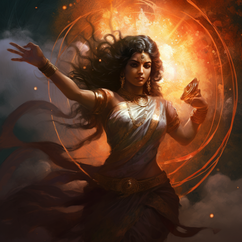 The portrait encapsulates the divine essence of Shakti, the revered Hindu goddess embodying feminine energy, power, and cosmic force. Radiating with ethereal grace and resplendent beauty, Shakti is depicted in her divine form, adorned with intricate jewelry and symbolic ornaments that accentuate her celestial presence. Her serene yet powerful gaze exudes wisdom, strength, and compassion, reflecting her role as the primal source of cosmic energy. The artwork reveres her divine femininity, portraying Shakti as the embodiment of creation, nurturing, and transformative energy that permeates the universe, honoring her significance in Hindu mythology and spirituality. --ar 4:7 --v 6.0