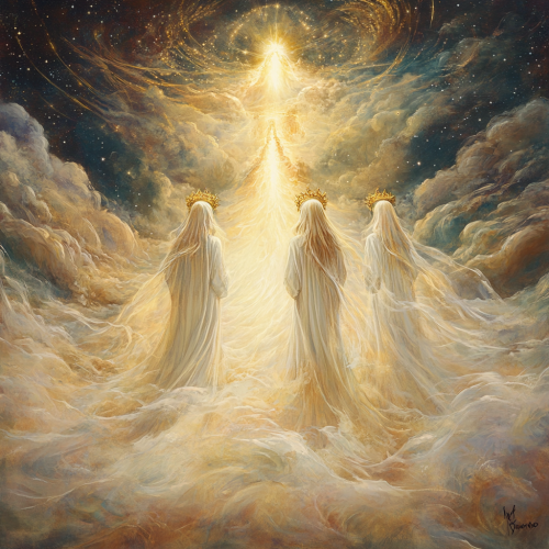 Create a celestial scene in a detailed, ethereal art style with soft, glowing colors and realistic, luminous figures. Depict three female figures dressed in flowing white robes, deeply bowing in reverence. Their bodies should be nearly prostrate, with their foreheads almost touching the glowing, ethereal ground beneath them. Each woman is offering their golden crown, extending it forward on a radiant path of light that leads to a distant, majestic throne of God, bathed in divine, glowing light. The scene should have the same swirling, luminous clouds and starry sky as the original, capturing a sense of divine worship and surrender in a rich, heavenly atmosphere, ar 8:5
