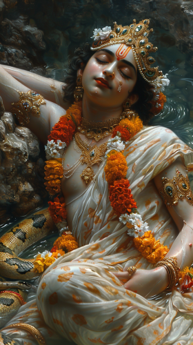 Lord Vishnu sleeping in ocean on snakes Dreams are nurtured --ar 9:16 --stylize 750 --v 6.0