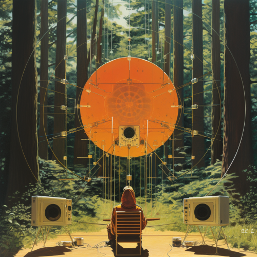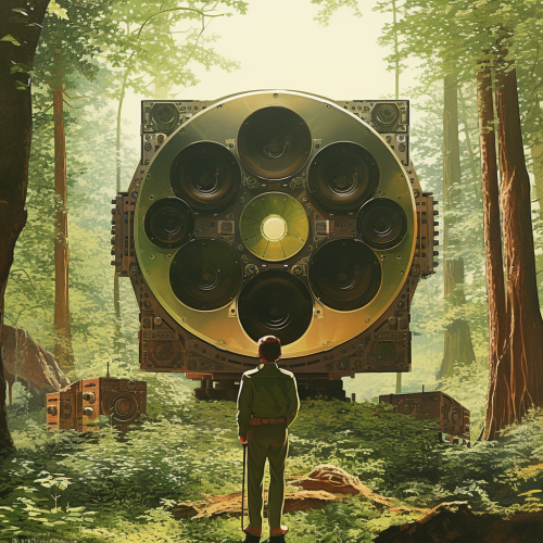 1970s softcover sci-fi style outdoor forest and a large speaker driver, zoomed out, Jean Giraud, solarpunk --v 5.2