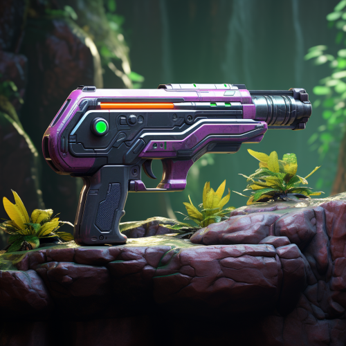 an image of a very high tech futuristic jedi hand blaster pistol. It is resting on a stone platform. Lots of green and purple colours. Futuristic style art. Very cool and inspiring.