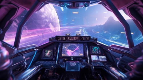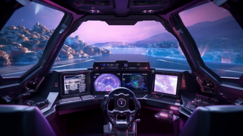 Chairless cockpit in a futuristic sci fi spaceship with big windows, hairs visual aesthetics and charts, and subtle smoke, very realistic, hyper-details, mix of cold colors and purple light, wide angle --ar 16:9 --no chairs