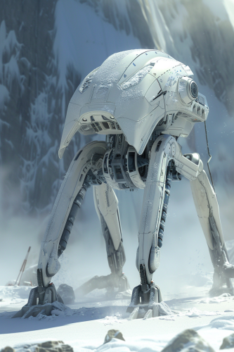 Create a super high-quality, realistic image of an advanced mechanized war machine, featuring a sleek, white, curvilinear exterior that exudes a futuristic elegance. The machine should be supported by sturdy, proportional legs, surrounded by white fog, hinting at its agile maneuverability through the landscape of a frozen ice planet. The legs should be designed with a modern aesthetic, complementing the tank's streamlined body. The war machine's surface should gleam with a pristine finish, yet bear subtle markings of warfare, showcasing its role in intense futuristic combat. The atmosphere should be charged with the remnants of battle, with the light casting a solemn pall over the ruins, creating a stark, cinematic contrast that underscores the scene's dramatic tension. --ar 2:3 --v 6.0