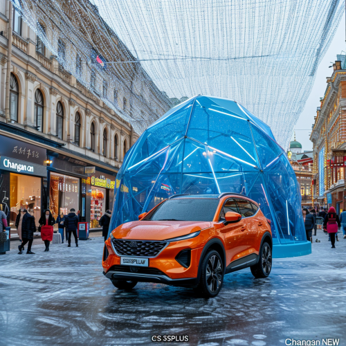 "Changan CS35PLUS NEW" car stands on a Moscow street under a blue protective dome, real images, 8K --v 6.0