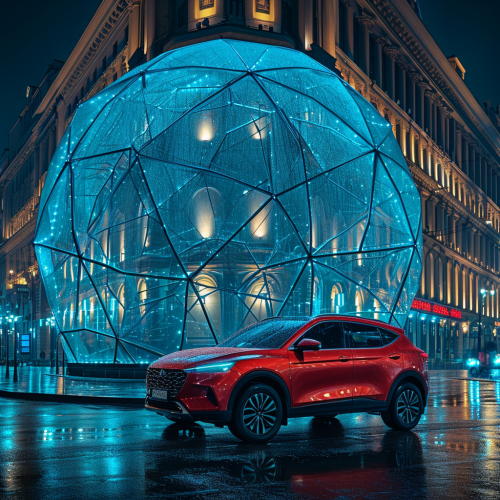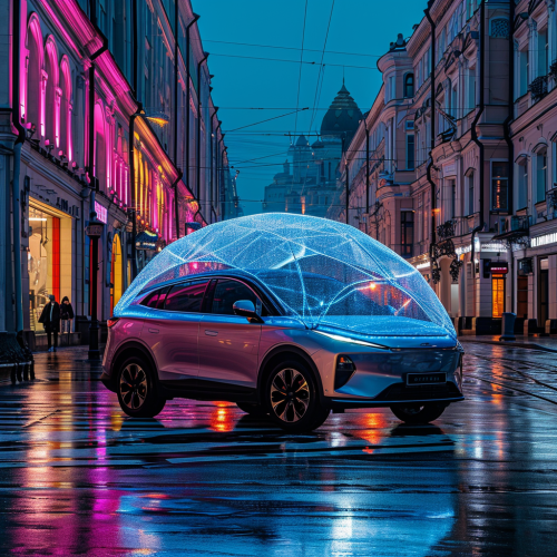 Changan's CS35PLUS car stands on a Moscow street under a blue protective dome, real images, 8K --v 6.0