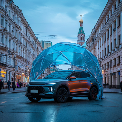 car "Changan CS35PLUS NEW" stands on a Moscow street under a blue protective dome, real images, 8K --v 6.0