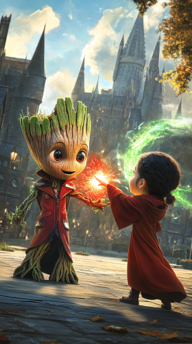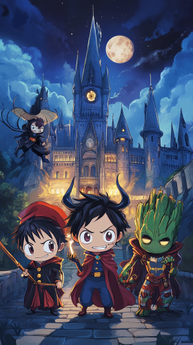 A chibi-style illustration featuring five characters from different universes gathered in front of Hogwarts Castle. Include: Maleficent from Sleeping Beauty, with her iconic horns and dark robe, exuding an air of mystical power. Luffy from One Piece, wearing Hogwarts robes and holding a wand, looking enthusiastic and adventurous. Iron Man from Marvel, dressed in a modified version of his suit with magical elements, ready to explore. Jafar from Aladdin, in Serpentard robes with his staff, looking cunning and ambitious. Groot from Guardians of the Galaxy, dressed in Gryffindor robes, radiating a warm and friendly aura. High quality, 8k resolution. --ar 9:16