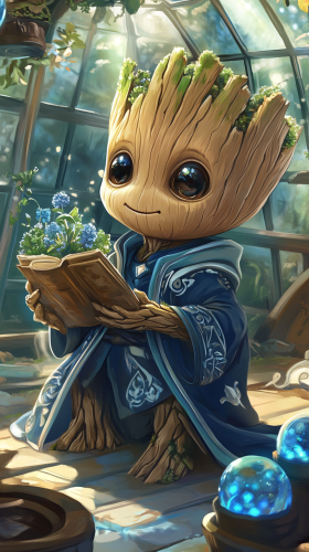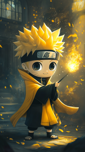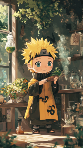 A chibi-style Naruto Uzumaki dressed in Hufflepuff robes. Naruto is happily engaged in a Hufflepuff activity, such as gardening magical plants or helping with potion-making. He’s wearing a yellow and black robe and showing his hardworking, loyal nature. The scene includes elements of the Hufflepuff common room or a magical garden, with a warm and welcoming atmosphere reflecting Naruto’s positive and energetic personality. High quality, 8k resolution. --ar 9:16